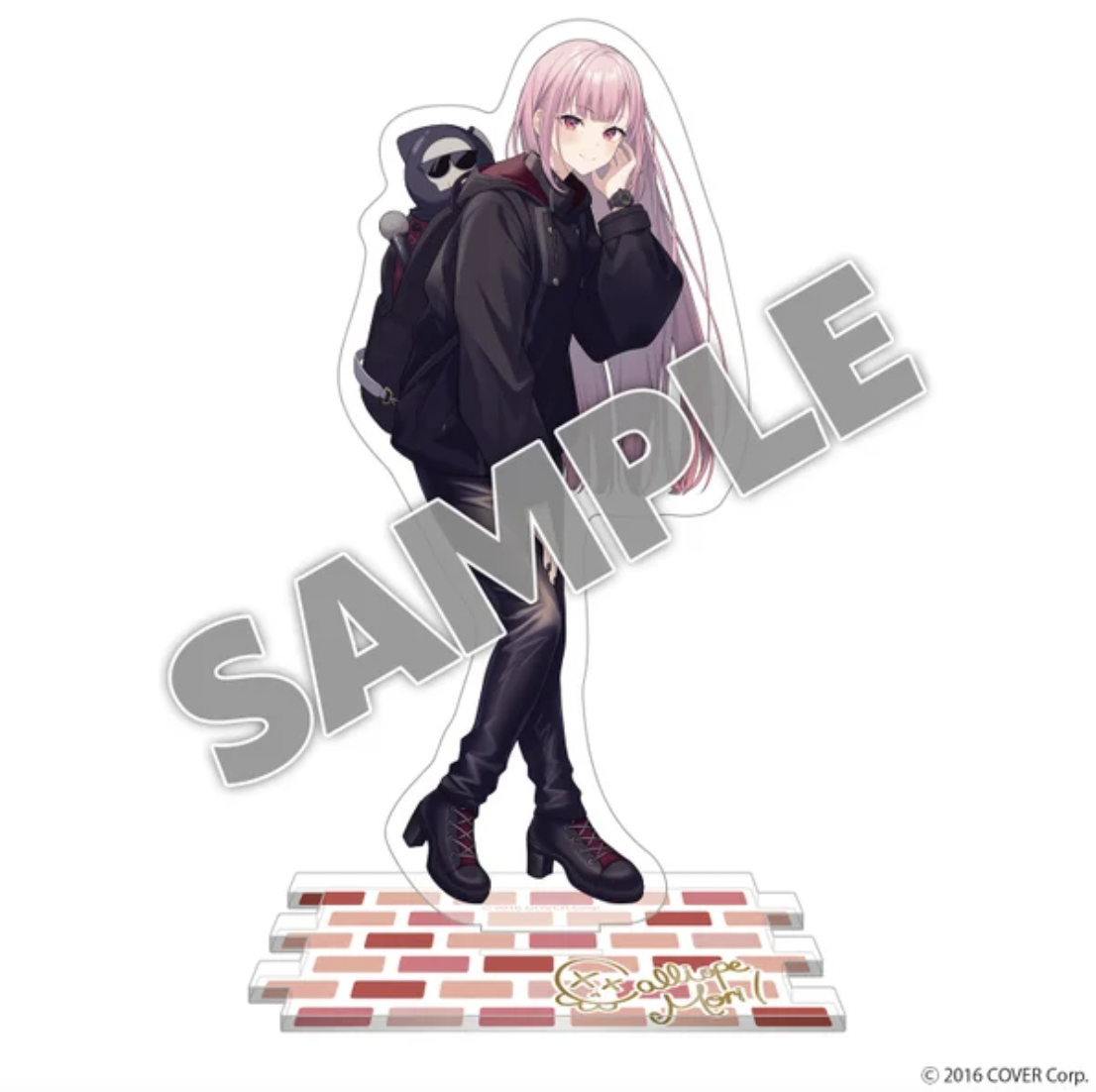 The acrylic standee of Calliope wearing the SuperGroupies merchandise is the cheapest item in the collection. It costs ¥2,750 (~$17). It is designed to interlock with the bases of the other Hololive English Myth Vtubers in this collection for a larger display. The same design appears on the A5 file that is included as a bonus with purchases of the watch, jacket, and backpack in the collection.