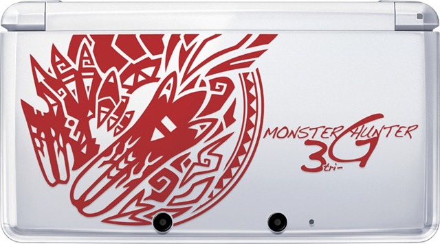 A Monster Hunter 3G bundle for the Nintendo 3DS in Japan? Shocking! Nintendo and Capcom will be selling the bundle (package shown above), containing the game, a special 3DS (below), AR card, charger, and 2GB SD card for 20,800 yen on December 10th.