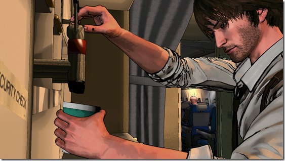As David exited the bathroom, he stumbled into Olivia Jones, a flight attendant who looked uncannily like his wife. After a brief, awkward conversation in which David inadvertently called her “Little Peggy” (his pet name for his wife) and she revealed that she knew he wasn’t on the flight manifest (then promptly dropped the subject). It was a delightfully awkward exchange that called to mind the strangely disconnected voice acting that made Deadly Premonition so charming. Sadly, the Microsoft rep in the room assured everyone that the voices were not necessarily final. I do hope they are. After this exchange, David walked out into the plane proper to continue his investigation into the drug lord known as D. While this isn’t necessarily the same D that killed David’s wife, this dealer had been pushing a new drug called “Real Blood” on the streets and might have had a connection to the murderer. The memento that brought David into the past was a badge that belonged to US Marshall Derek Buchanan. David brought his badge over to him and confronted him about… something vague enough for the audience to not know what it was. It seems as though the two had history, and the Access rep guided David through some flippant responses to each threat that Derek threw his way. SWERY said that encountering the owner of each memento lead to a higher “Synchro rate” for each memory you dove into.