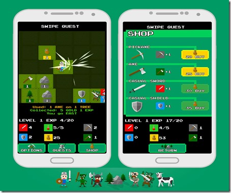 Swipe Quest combines grid puzzles, roguelike RPGs, and just a hint of math to make for a bit of a unique game. Published by Evil Indie Games, Swipe Quest has players swiping through huge amounts of enemies, quests, and landscapes in an effort to reach higher and higher experience levels. Like many other roguelikes, players move one of many different adventurers through a randomly generated world, trying to collect as much gold and goodies as possible. The only difference here is that the world is on a grid, similar to games like 2048 or 1024. And besides killing bad guys, players will also have to cut their way through trees and mine their way through boulders. Each enemy, tree, and boulder has a number on it. The player needs a certain number of tools (axes for trees, swords for enemies…) to be able to slice through whatever is in his or her path. If two tiles of the same type touch, then the numbers will combine. For example, if a two trees tiles with the number “1” on them touch, then a singular “2” tile is formed, making it harder for the player to cut through it. It requires a bit of quick mental math to keep track of all the numbers, but that is what gives Swipe Quest the feel that it is not just another dungeon crawler, but is actually a puzzle game in disguise. Besides collecting tools and gold, which can be used to quickly buy more tools, players also come across random quests. These typically have some element of humor in them, like ‘find three lost cows for some poor, helpless farmer.’ Ultimately, these quests give the gameplay more of a purpose, and keep things fresh and interesting. Swipe Quest is currently available for iOS, Android, Mac, Linux, and PC.