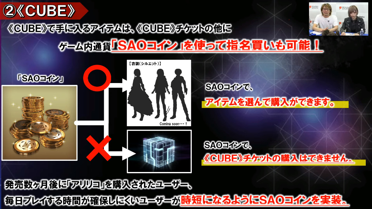 If your ‘Lootbox Sensor’ or ‘Gacha Sensor’ alarm is going off, that’s because Cubes essentially are those. You’ll get outfits, weapon skins, accessories, expendable items, emotes, and more from Cubes. Outfits and weapon skins are purely cosmetic. That said, there is one big difference in the implementation of Cubes and SAO Coins compared to some other ‘lootbox’ strategies – you don’t use SAO Coins to buy more Cubes. Instead, SAO Coins are used to directly purchase the items like outfits and skins from SAO Shop, and cannot be used to buy Cubes at all. Cubes can only be opened with Cube Tickets earned through Daily Quests and other events. You can also buy expendable items in the SAO Shop. Essentially, SAO Coins and paid purchases are a ‘get it quick’ option that spares players the randomness of the gacha. Here’s the currently announced real world prices in yen for SAO Coins: