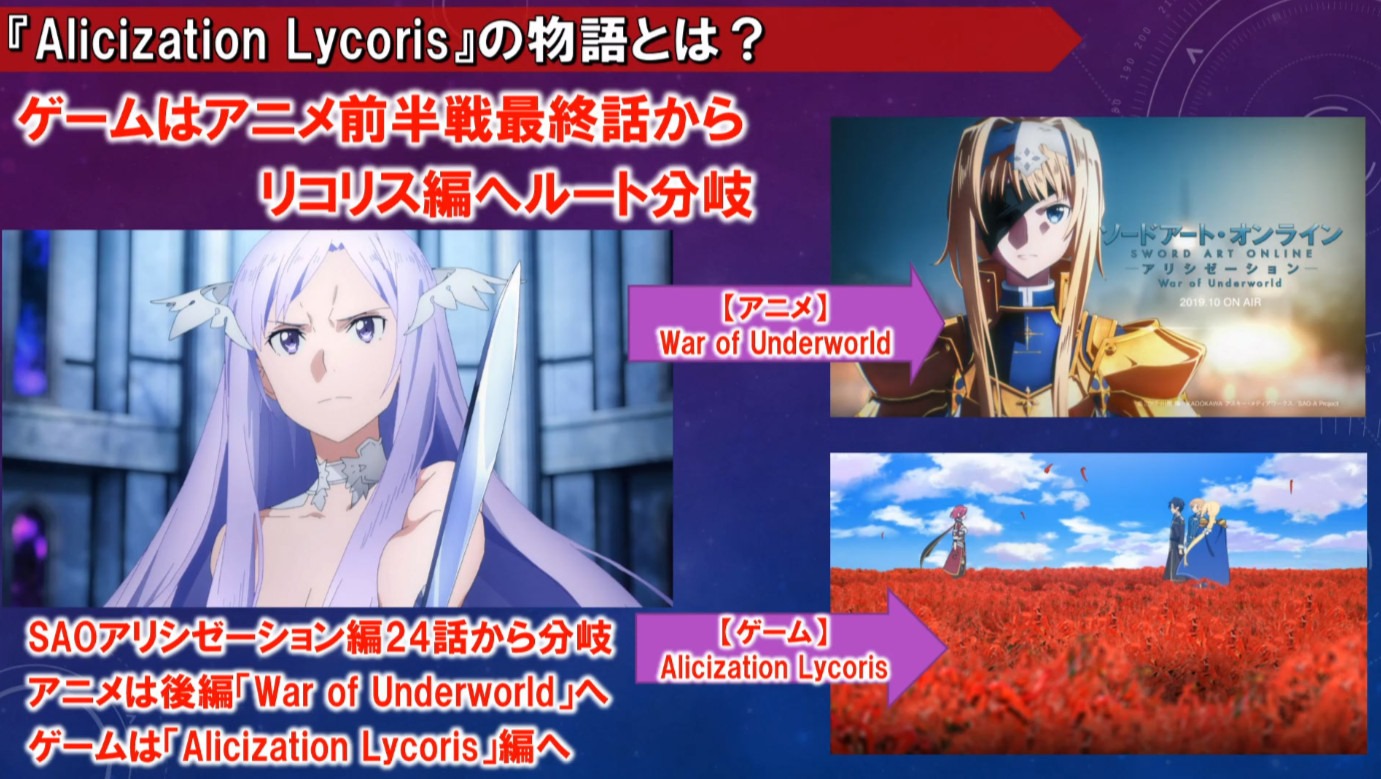 Sword Art Online: Alicization Lycoris basically takes place after the 24 episodes of the Sword Art Online: Acliziation anime. Following the Alicization anime it splits into two different story arcs—one being the upcoming anime Sword Art Online: Alicization War of the Underworld that airs next month, and the other is the story of the Sword Art Online: Alicization Lycoris game.
