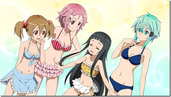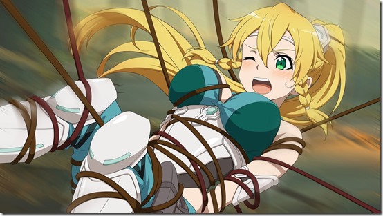Here’s a look at a couple event CGs. One shows the girls going shopping in their bathing suits, and the other shows Leafa caught in a trap.