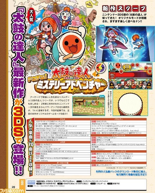 Bandai Namco announced Taiko Drum Master: Doko Don! Mystery Adventure in this week’s issue of Famitsu magazine. While details on the game are light for the time being, the report notes that the game has an original RPG-style mode called “Mystery Adventure Mode” which we’ll learn about in future updates. Taiko Drum Master: Doko Don! Mystery Adventure is in development for Nintendo 3DS.