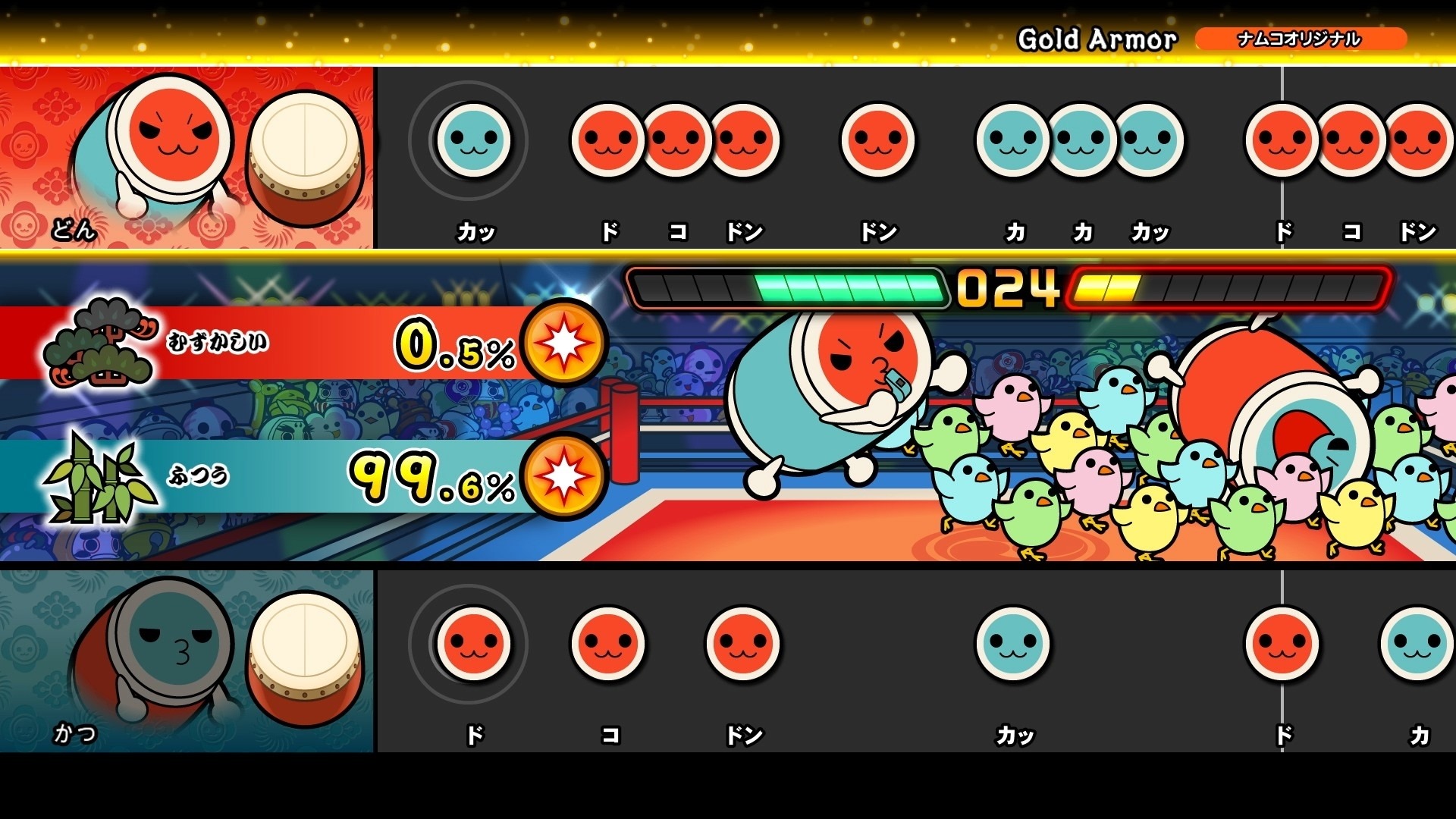 Don Katsu Fight is a special 1v1 versus mode where the goal is to knock down your opponent’s HP to zero to win, or have the higher remaining HP when the song ends. The mode is compatible with all songs in the Switch version, as well as all DLC songs. Sadly, it is local-only with no online functionality. You attack by playing well in order to store up power. When the power percentage reaches 100% you’ll launch an attack against the opponent’s HP.