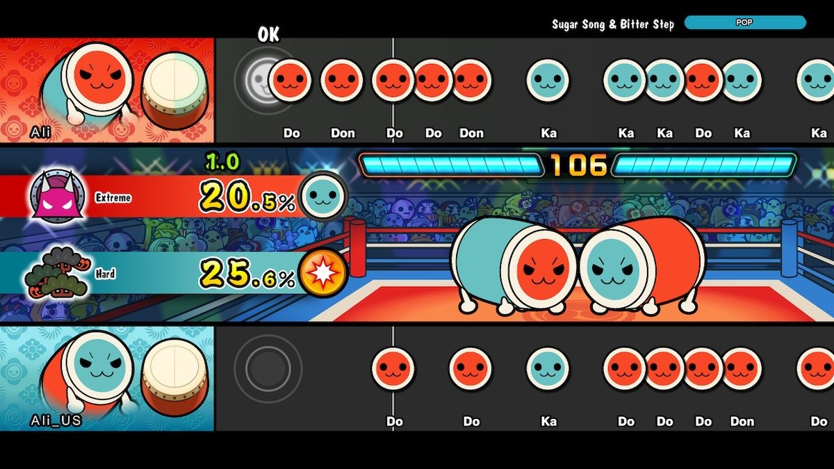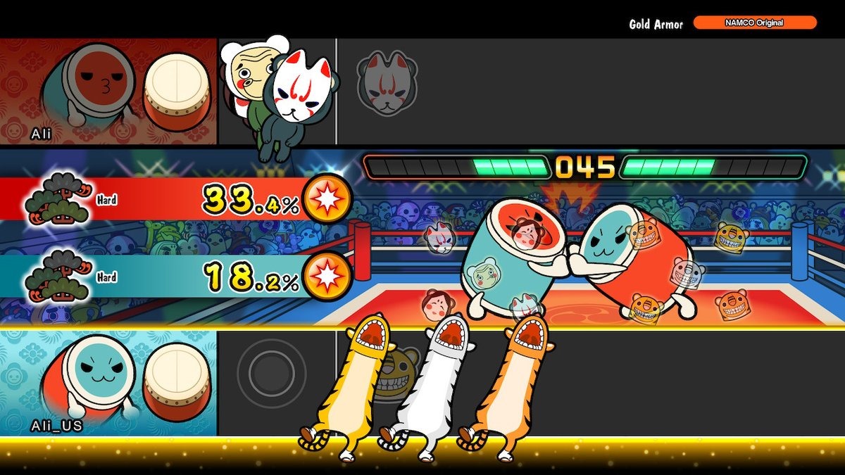 If the regular versus mode was the Ridge Racer of rhythm game versus modes, this would be the Mario Kart equivalent. In this mode, players strive to knock down their opponent (only Don-chan and Kacchan are available in this mode) down to zero health. How you damage the opponent is, of course, by playing through a song and doing well. This fills up the percentage number, and when it reaches 100%, you unleash an attack that deals one bar of damage. If both players are still standing by the end of the song, the game goes to whoever has more remaining HP – or a draw if HP is equal.