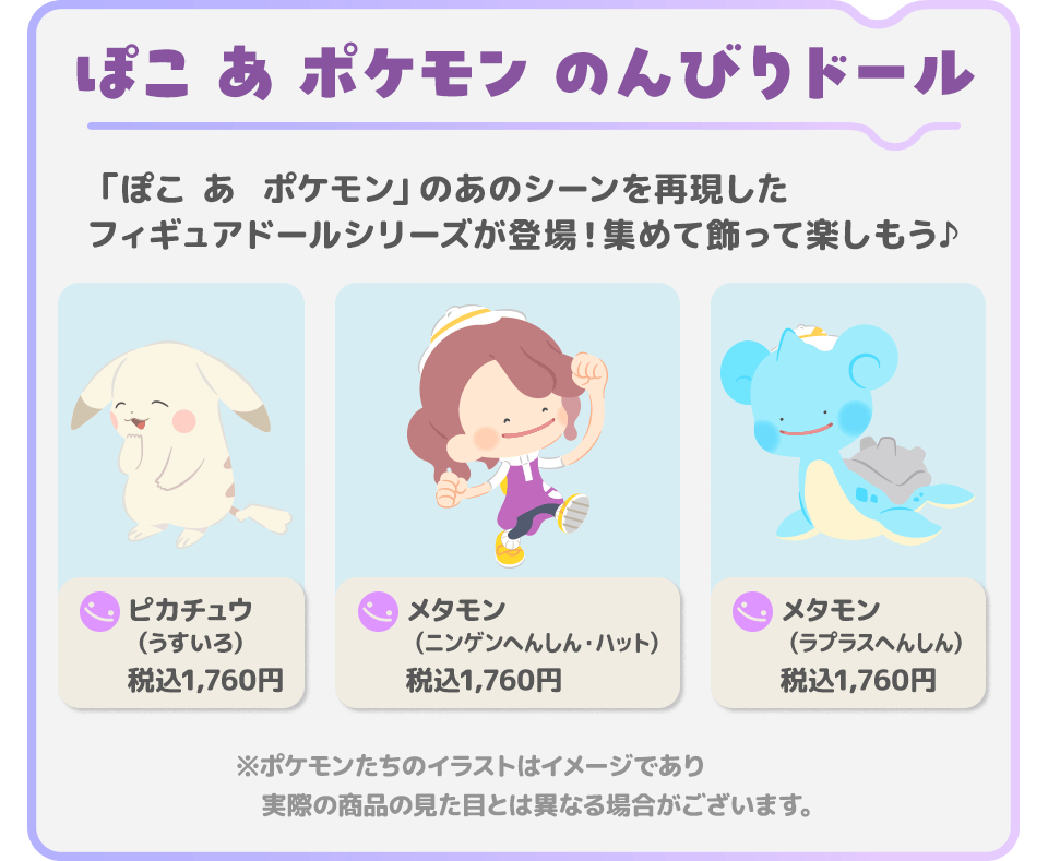 The three Nonbiri dolls will be figures of Ditto masquerading as a human girl, Ditto as a Lapras, and Peakychu. These will be 1,760円 (~$11) each. Again, concept art appeared on the official site. As the human Ditto and Peakychu designs there looked different than the ones shown for the Moncolle ones, it’s possible those could be closer to the final poses for that line.