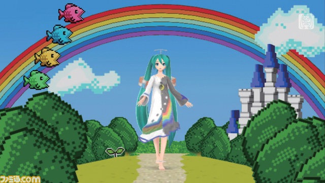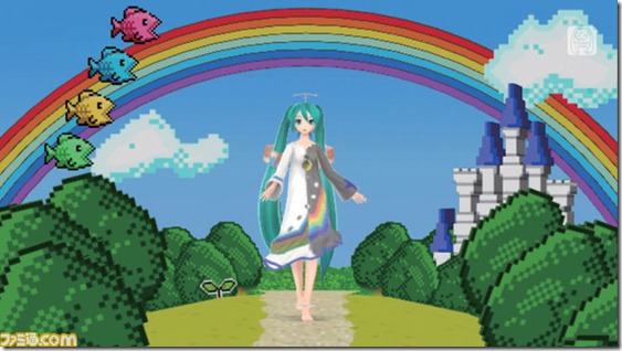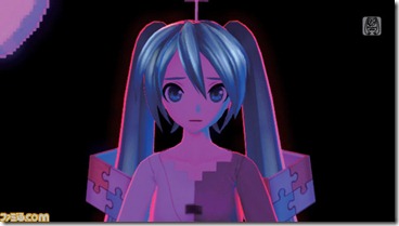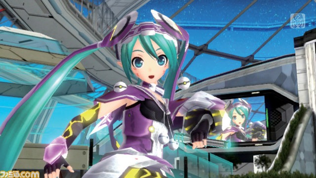 As reported earlier in the week, Hatsune Miku Project Diva f will feature a Phantasy Star collaboration in one of its songs—“Netgame Addict Sprechchor,” by Satsuki Ga Tenkomori. This morning, Famitsu.com posted screenshots from the song, showing it off along with the FOnewearl-style module for Miku: