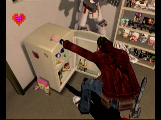 Opening the fridge and grabbing a bite to eat restores Travis’ health meter.