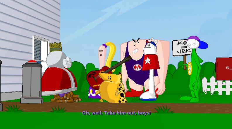 He then hears noise, and sees Homestar, Marizpan, The Cheat, Coach Z and Strong Mad outside in the front yard, engaging in a peaceful protest of Strong Bad’s imprisonment. They even created an effigy of the King, which doesn’t resemble him much, and started collecting creamy ding snack cakes to pay the tax and free Strong Bad.