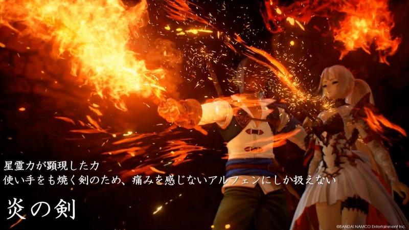 The flaming sword is powered by Astral Energy. It constantly burns the hand of the wielder, so only Alphen who doesn’t feel pain is able to use it.