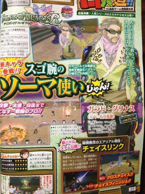 Garad Grinas will be another new playable character joining you in Tales of Hearts R, according to a report in Japan’s Jump magazine (via: Tale Tale Source). Garad, pictured to the right, accompanies the game’s protagonist, Shing Meteoryte, to help stop the Despir disease. He frequently compares female heroine, Kohaku Hearts, to his daughter. Garad wields an axe and machete. He can use the new Chase Link system, with attacks like Cross Chase and Chase Finish, which is a finishing move.