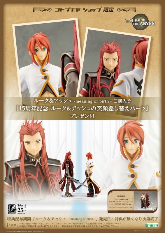 The Tales of series 25th anniversary means Bandai Namco and companies are celebrating with things like new games, special events, and merchandise. Kotobukiya revealed on Twitter that it will offer celebratory Tales of the Abyss Luke fon Fabre and God-General Asch figures in June 2021 as a tie-in product. However, it doesn’t just celebrate the series as a whole’s anniversary. It also honors Tales of the Abyss’ 15th anniversary, which passed on December 15, 2020.