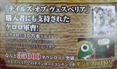 Sales of Karol’s Keroro (aka Sgt. Frog), one of the paid downloads in the PlayStation 3 version of Tales of Vesperia, broke the 35,000 mark.