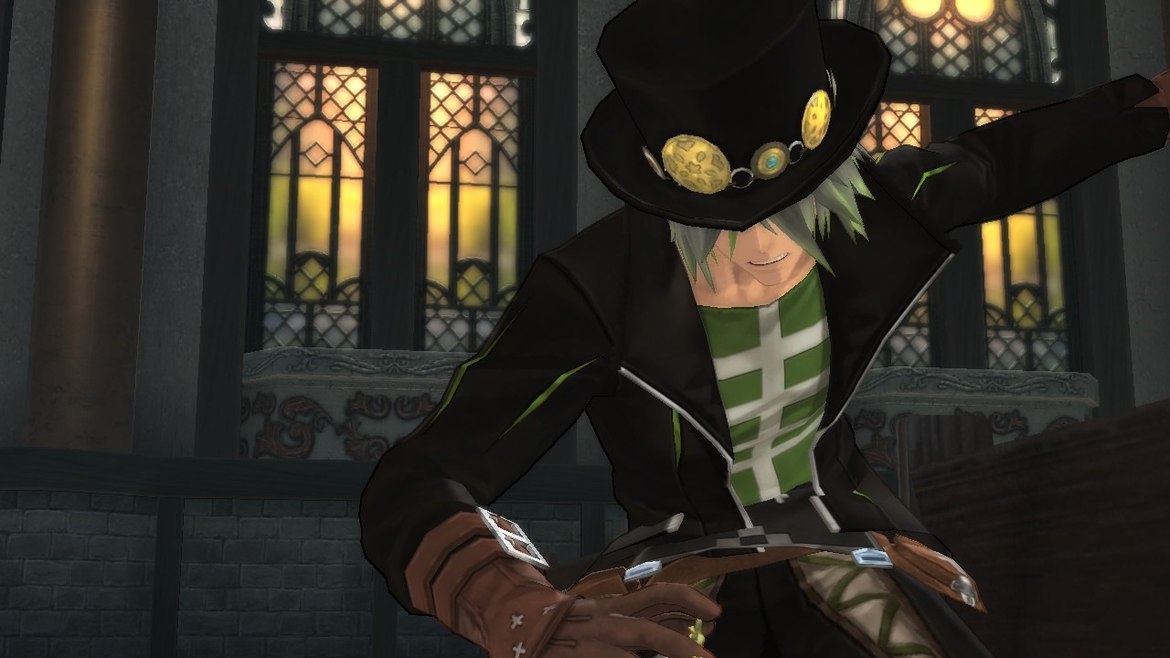 The Wild West Outlaw-looking Heavenly Tribe member, Dezel, fights with a special pendulum he carries around, using wind-attribute powers. He can use the pendulum as a whip to cover a wide range around him, which goes well with his keen sense of stepping in to take advantage of openings. With wind-based Heaven Echo Artes being his main attribute, he has some Artes that can attack forward and his sides, which allows him to control a good area of the battlefield while rounding up enemies.