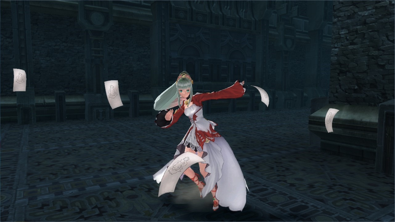 As previously reported, Laila is part of a fire-element Heavenly Tribe, which also shows in her fighting style. Using a special spiritual paper as a medium, Laila can freely pull off fire attacks. The fire is efficient at binding enemies, so that helps for keeping enemies in place even after combos. Laila excels at fire-based Heavenly Echo Artes, and can put up quite the fight in close-ranged combat.
