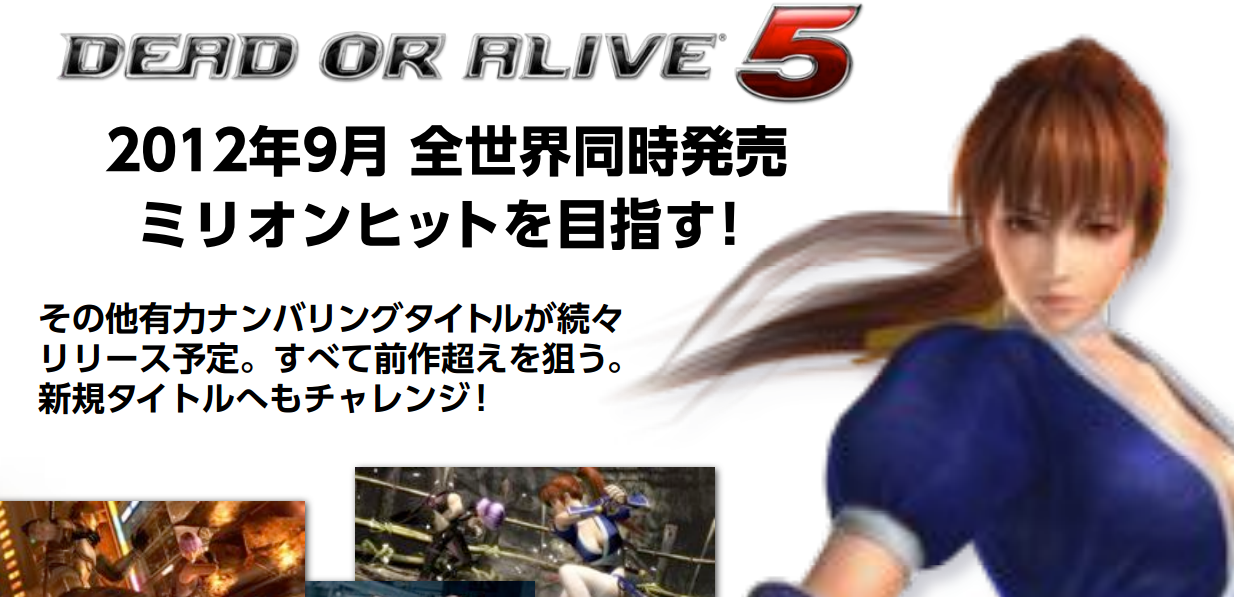 And just to put that in perspective, Ninja Gaiden 3 shipped 630,000 units and Warriors Orochi 3 moved 480,000 units worldwide. Dead or Alive 5 will have a global release in September.