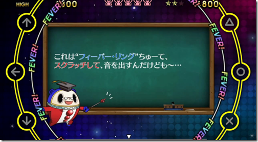 Next, he shows us a look at the “Scratch” mechanic. Basically, it happens when you see a blue ring appear from the center, and you’ll have to tapping the analog stick left or right when it aligns with the yellow circle with the buttons. Once you get it, it’ll imitate the sound of a DJ “scratching” his turntable to give you extra points; however, you don’t need to worry if you miss, as this is a bonus segment and you won’t get any penalties for failing it.