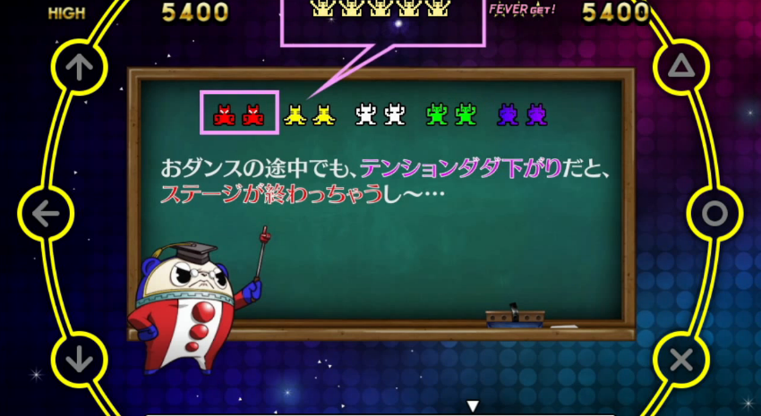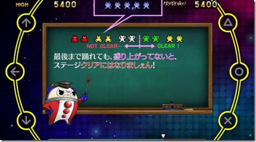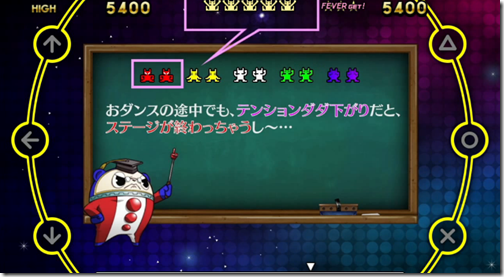 Finally, he shows us a look at the Groovy Gauge, indicated on the top part of the screen. This shows how much the audience is digging the groove, but it also indicates when their tension is low when it goes red, meaning you’re also in danger of the stage ending earlier.