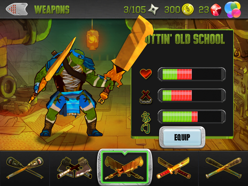The mobile version of Teenage Mutant Ninja Turtles is a 3D side-scrolling action brawler which lets players take on the persona of one of the four turtles—Leonard, Donatello, Michelangelo and Raphael—and beat down on bad guys such as the Foot clan and mutants.