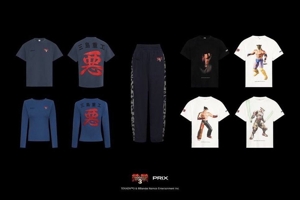 A teaser image shows seven items that will be in the PRIX collection. On the left are two different King shirts. One is the classic short-sleeved grey shirt, while the other is a long-sleeved blue one. On the front of each is the Tekken 3 logo. In the middle is King’s pants, with the game’s logo on the front. There will also be t-shirts with Jin Kazama, King, and Yoshimitsu on them.