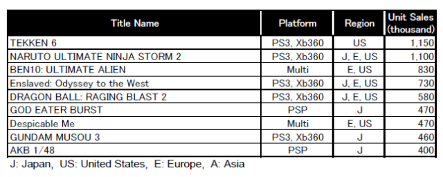 Naruto and Tekken are valuable global properties for Namco Bandai; both series helped bring in some of the company’s highest sales numbers last year. Tekken 6, released on consoles back in late 2009, sold 1.15 million copies worldwide this past fiscal year. Meanwhile, Naruto Shippuden: Ultimate Ninja Storm 2 sold 1.1 million copies.