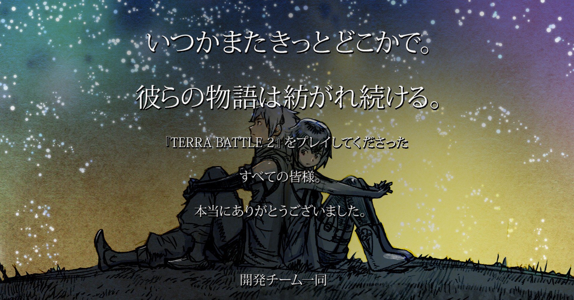 『TERRA BATTLE 2』をプレイしてくださった すべての皆様。 本当にありがとうございました。 2018年8月16日 開発チーム一同 pic.twitter.com/WVTfJMUDlT — テラバトル2 (@terrabattle2jp) August 16, 2018