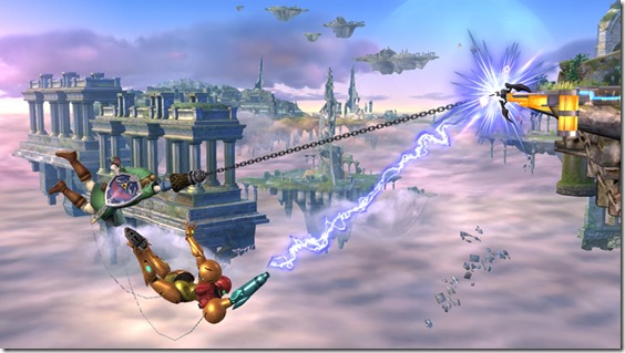 Tether Recovery is back in the new Super Smash Bros. game. Director Masahiro Sakurai showed the feature off in a new screenshot on Miiverse, featuring Samus and Link.   “Tether recovery? Yes, you can! And from even longer range than before,” Sakurai wrote. “Multiple fighters can latch on—who actually grabs hold is determined by the same rules as the standard ledge grab.”   Super Smash Bros. will be available on Nintendo 3DS this Summer and on Wii U in Winter.