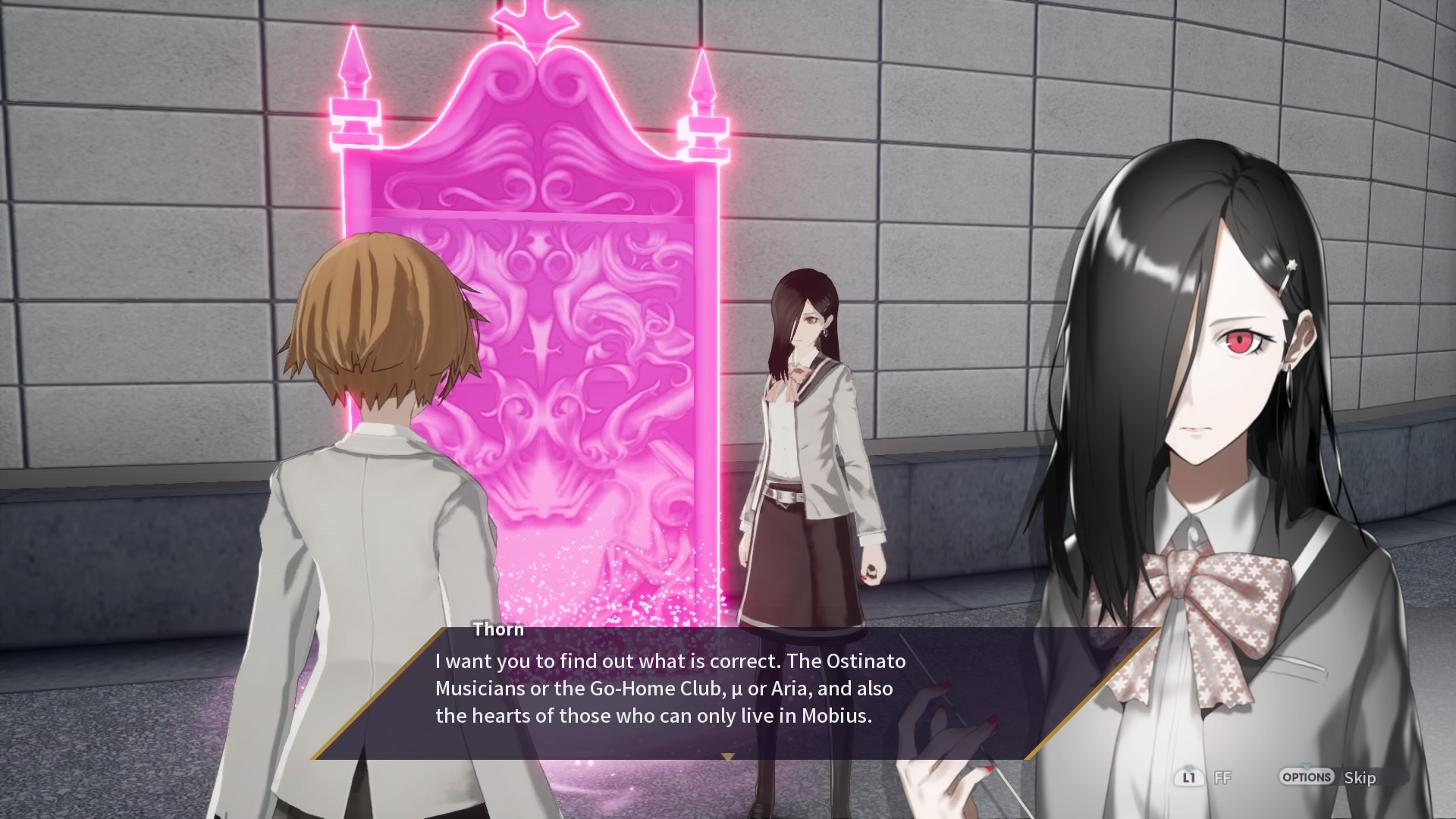 There is a suggestion that some of the best-written villains are the ones whose stories make them look like the hero from their side. The Caligula Effect: Overdose offers an opportunity to think about that, thanks to the ability to join the antagonistic group. In the original The Caligula Effect, you could only be a part of the heroic Go-Home Club that fights to escape the virtual world of Mobius and return to reality. Here, your allegiance can shift to offer an additional perspective. First of all, the Ostinato Musician story elements aren’t something you decide to opt into right from the outset of The Caligula Effect: Overdose. The game starts by establishing you as a member of the Go-Home Club. You have to fully complete both Kagi-P and Sweet-P’s arcs. This means you have a sense of what is going on in the world and get some hints as to the identity of Thorn, the Ostinato Musician’s leader. Then, before taking part in the new Stork arc, you will have an opportunity to go to the station. There, Thorn will be waiting under the bridge with a door and an option.