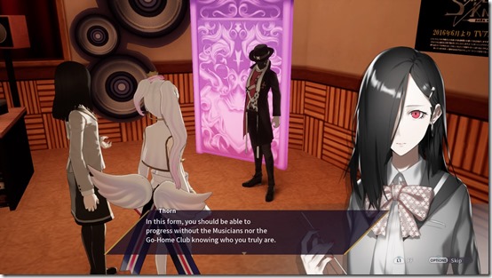 Thorn makes a case for not making a decision about Shogo and the Go-Home Club being 100% in the right without knowing about the people in the Ostinato Musicians and rest of Mobius first. The recruitment seems similar. You meet. You visit their unique room. You get a disguise, which is Lucid, the mysterious new musician with an original look designed to hide the protagonist’s identity. This includes a theme song. However, this isn’t a true alternate route. Instead, you have options. After getting your Lucid identity, the Stork arc proceeds as normal. You work alongside the Go-Home Club to face him and undertake his dungeon. But after that, Lucid is introduced to two of the most recently defeated Musicians, Sweet-P and Stork. You then work with them to brainwash people at the school again. Once it is all done, you just happen to return to the Go-Home Club just when all the excitement ends. However, this storyline does mean seeing another side of things. In addition to completing all of the Go-Home Club character segments, which lets you learn more about their lives and inner trauma, you get to go through the same sorts of episodes for each of the Ostinato Musicians, getting to learn why they are the way that they are and help them come to terms with what has happened to them. (In fact, getting through such stories when they come is important, if you want certain characters to live or die in the story.) You also get to see the “good” guys in more of an antagonistic role. While escapism isn’t the best option, seeing the Musicians in this way at least makes it easier to understand. Especially since a few of them seem like they’ve had to deal with extraordinary circumstances too.
