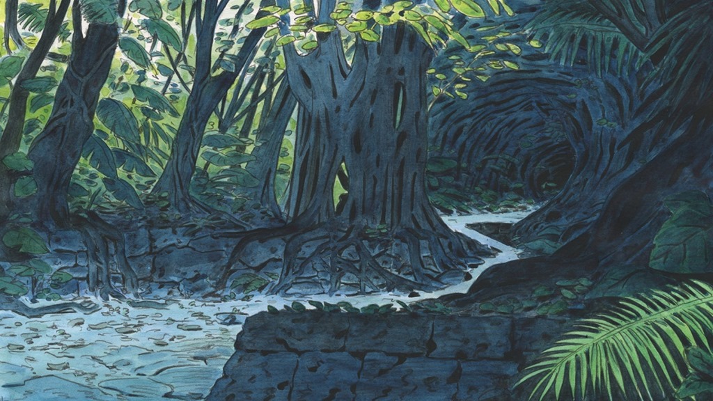 We’ll take a simple scene as example. This scene takes place in the forest. Like most of the game’s locations, this one is inspired by a real place we visited in Okinawa: Sueyoshi Park in Naha. Here is the watercolor sketch we made on location: