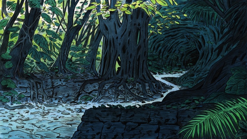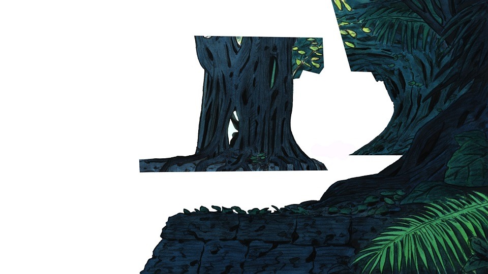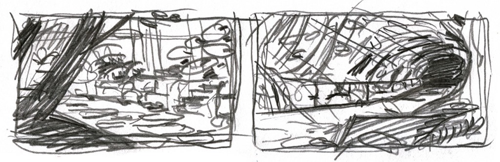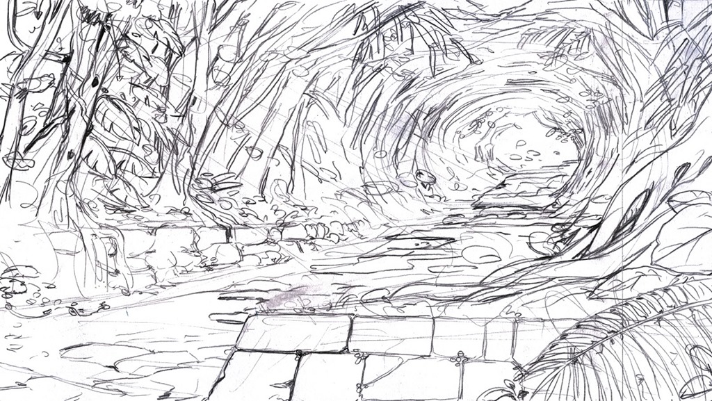 We love that place because it looks very ancient and mysterious. The forest is dense and only a few rays of light make their way through it. It was exactly the look we wanted for the entrance of the Spirit World. It’s a good base for the scene. We start with a few small sketches: