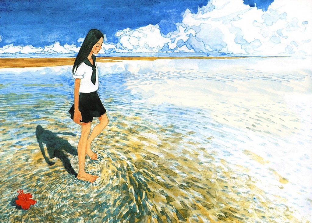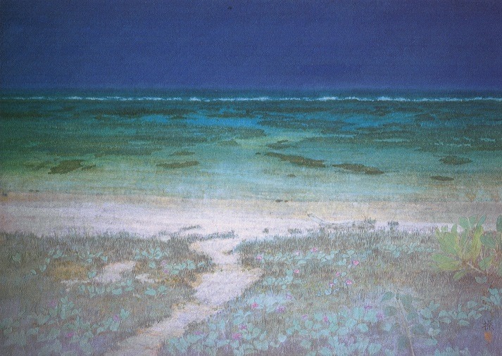 We came across Misao Shimizu’s paintings in a second hand bookstore in Sendai, in August 2012. We were spending a few days in Ishinomaki, a city that had been terribly damaged by the tsunami the year before. In our way to attend a small matsuri (a traditional festival) on a sacred island, we walked across devastated areas. Entire villages wiped off the map. It deeply affected us. When we opened Misao Shimizu’s book in that bookstore, it instantaneously brought us back to the warm ambiance of Okinawan islands. Somehow, it helped us to handle the sadness.