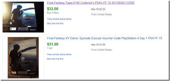 Surprisingly, people are selling their Final Fantasy XV demo codes for about half the price they would have paid for Final Fantasy Type-0 HD, with which the demo is bundled. As you can see on the eBay listings, the demo is fetching prices of up to $36, with the cheapest price being about $20. Taking a sample of 36 of these eBay listings, the mean average of the Final Fantasy XV’s demo price is $29.40, with the median average being a firm $30. The Day One Digital Edition of Final Fantasy Type-0 HD on PlayStation 4 and Xbox One is selling at the full price of $59.99. So, the people who bought that to get the Final Fantasy XV demo are easily getting half their money back by selling it on.