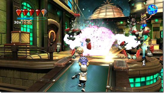I played a combat stage next, which starred Ratchet and his wrench. The goal was to find these octopus-like alien creatures and bring them back to a goal before time runs out. Robots showed up to stop Ratchet, but I destroyed them by swinging the Move controller around. PlayStation Move Heroes has a simple combo system where shaking left, right, and then left, makes Ratchet dish out a few extra hits. In the demo you couldn’t do diagonal hits, they would either come out as a vertical clonk on the head or horizontal hit. The navigation controller’s analog stick is used to move Ratchet around. An interesting fact about this mode, as explained by a Sony rep, is this mode didn’t always have a combo system. Originally, it was just based on a player’s movements, but combos were added in after some of the development team felt it took too many hits to defeat the robots.