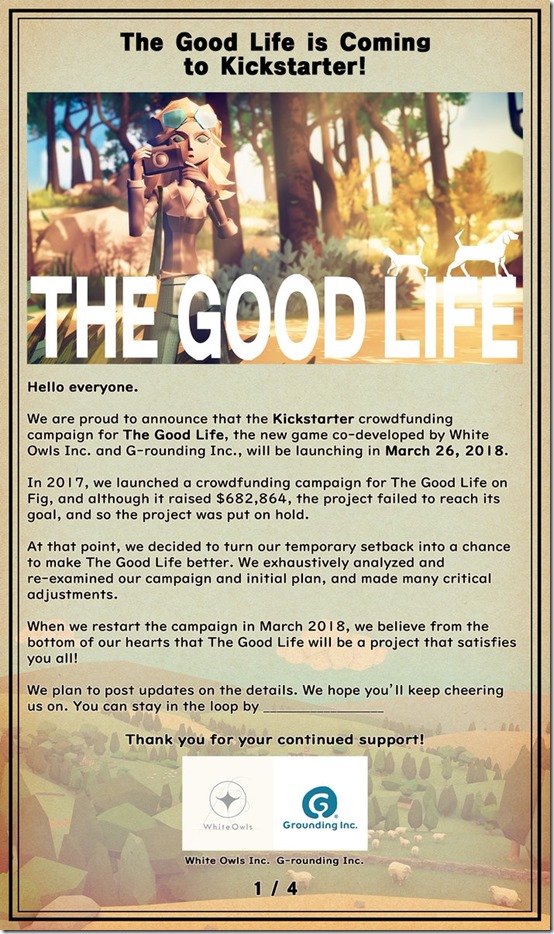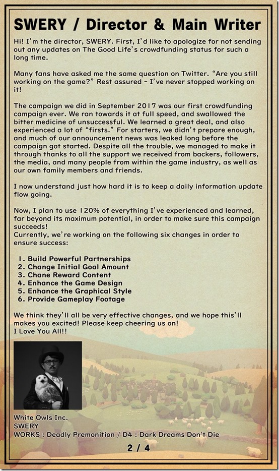 Hidetaka “SWERY” Suehiro’s project, The Good Life, previously had a crowdfunding campaign at Fig that got 45% of its goal of $1.5 million back in October 2017. With only $682,864 from 3,478 backers it wasn’t enough for the green light it, was back to the drawing board for the crew.