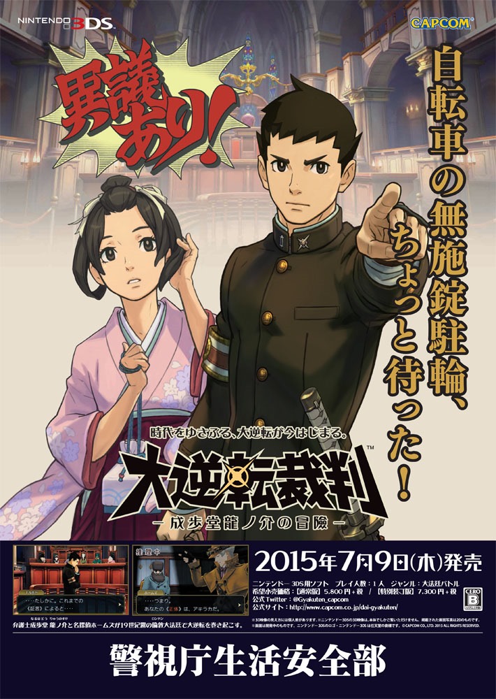 In the Great Ace Attorney, Phoenix Wright’s ancestor, Ryunosuke Naruhodou, will be one of the earlier attorneys in Japan around the time the Western judicial system was introduced. Capcom have announced that he’ll help out in present day Japan in real life with an anti-bicycle theft campaign. The poster reads: “Those of you parking bikes with no locks—wait right there!” It’s a message to remind cyclists in the Tokyo Metropolitan area to make sure they keep their bicycles properly locked in order to prevent bicycle theft, which seems to be an ongoing problem in the area. This collaboration with the Tokyo Metropolitan Police Department will have the posters throughout Tokyo, and they’ll also have events sponsored by the police department to further spread the awareness of bicycle theft. As you can see, the poster also has some screenshots for the game along with a release date, which is actually a pretty interesting way to promote the game while also spreading a good message for the citizens in Tokyo. Capcom also recently shared a look at some gameplay details, where we get to see how Ryunosuke Naruhodou will work with Sherlock Holmes on the game’s second case, where Ryunosuke finds himself in trouble while on a ship ride to London. The Great Ace Attorney will release in Japan on July 9, 2015 for Nintendo 3DS.
