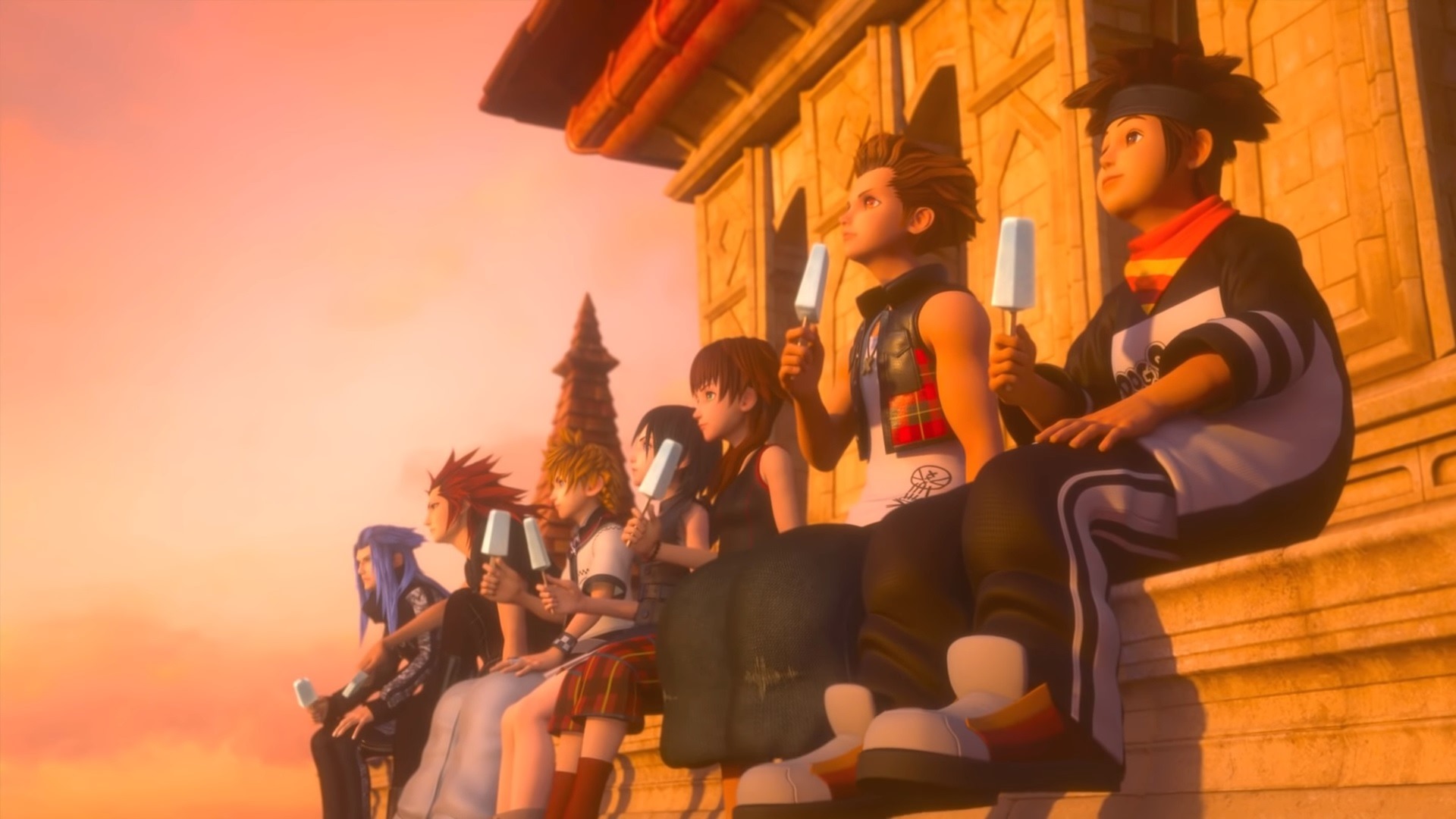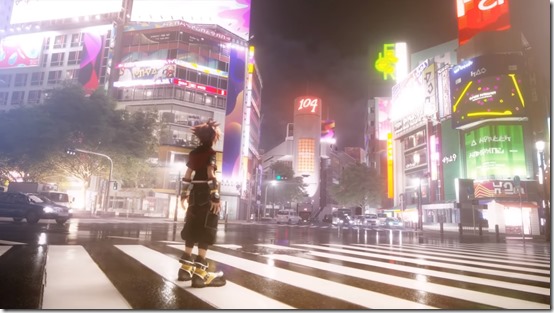 The Kingdom Hearts III secret ending is more mysterious and shorter than the epilogue. To start, earning it isn’t as complicated as, say, finding 101 Dalmatians. If you are playing on the easy Beginner difficulty, you need 90 of the Mickey-shaped Lucky Emblems. The Standard normal mode requires 60 emblems, and the Proud hard option only requires you to find 30. You also have to have downloaded update 1.03 and beaten the game. Once you acquire all of the Lucky Emblems, you get to see this additional movie. It shows Sora and Riku in two new locations. Both the characters and worlds look more realistic than they have in past Kingdom Hearts games. Sora is in front of The World Ends with You‘s 104 Building in the game’s version of Shibuya. (We can tell this isn’t the real world, since it isn’t the actual 109 Tokyo Mall Development department store in actual Tokyo.) Riku is in an area that initially bears a resemblance to the world of Final Fantasy XV, but is actually shown to be the world of the Verum Rex video game we saw in Kingdom Hearts III‘s Toy Box world, complete with Yozora watching Riku from above. We also see someone in an Organization XIII coat looking at the moon in the sky while making a heart with their hands. Someone could see this as hope for the future and a fourth installment, just as the epilogue suggests more is on the way.