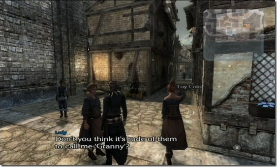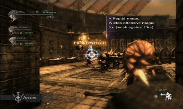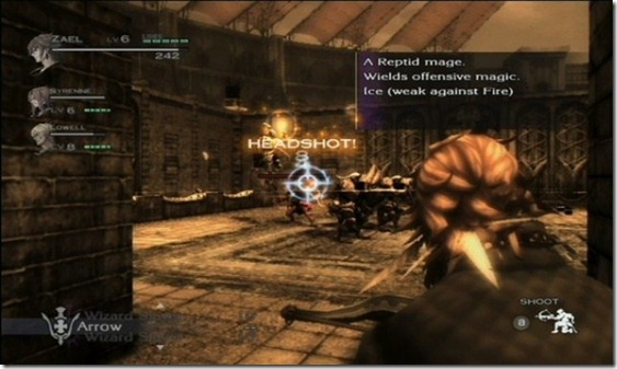 After an introductory exploration, Zael takes the stage. Zael could be considered a rogue in terms of class, as he doesn’t rely solely on the blade. He’s equipped with a bow and arrows and indeed, the initial introduction has him working with Yurick as backup, providing an assault from above. Shooting is easy enough, as a push of a button switches to a first person view. Unfortunately, you can’t just point the Wii remote at the screen to aim. You have to move the analog stick to search the area for potential targets. Also helpful is the fact that Zael possesses special kinds of arrows designed to take out mages and this view can be used to find weak points. As the group regroups and scours the temple, they learn the area also happens to be home to ruins. This calls for more splitting up, to search for an exit, and a nearly disastrous outcome that almost results in Syrenne being killed and Zael being left alone in a hopeless situation. It’s then that a mysterious voice speaks, a strange light appears and Zael ends up gaining the Gathering ability from The Outsider spirit. When activated in battle, this ability makes enemies target only him, allows him to revive downed allies and lets his magic wielding partners cast spells better. He also eventually learns Burst attacks with it, but initially it serves as a means to resurrect the injured Syrenne and defeat the ruined temple’s guardian. It’s after that victory that we finally get the first opportunity get to know the other mercenaries and explore the city. The base of operations is a tavern run by a village girl named Ariela and her family, and it’s here that Zael actually gets the opportunity to socialize with his peers and purchase some equipment. While weapons can be stronger or weaker, most standard armor tends to be equal aside from the bonus effects. All equipment changes the appearance of the mercs when equipped. Zael also has the opportunity to choose what he says in conversations with his friends, but I didn’t notice any striking differences if I chose to say something different. I found I didn’t realize how pretty The Last Story was until Zael was able to explore the town. There’s only one, but the game makes up for it by making it absolutely gorgeous. Only a few basic areas with story centric spaces, shops and an arena are open initially, but more open up later and you can automatically warp to most areas you want. What helps the appreciation is the ability and need to shift to a first person view at times, since you can get a fresh perspective on what you’re seeing. It’s here that Zael meets the Count Arganan and General Asthar’s knights and remembers how much he longed to be one. But it isn’t always about doing Count Arganan’s bidding and coming closer to Zael’s dream. Upon returning to the tavern, the group learns Ariela’s little brother is ill and thieves have stolen the medicine. Zael, Dagran, Lowell and Mirania set out to make things right with a retrieval operation that not only results in the medicine’s recovery, but also introduces a former friend and current foe called Zoran and a plot to release Reptids and another monster in the city to cause confusion and damage. The group saves the day, showing what good mercenaries are capable of, but only Ariela, her brother Warren and her family will ever know what Zael did for both Lazulis and their family.