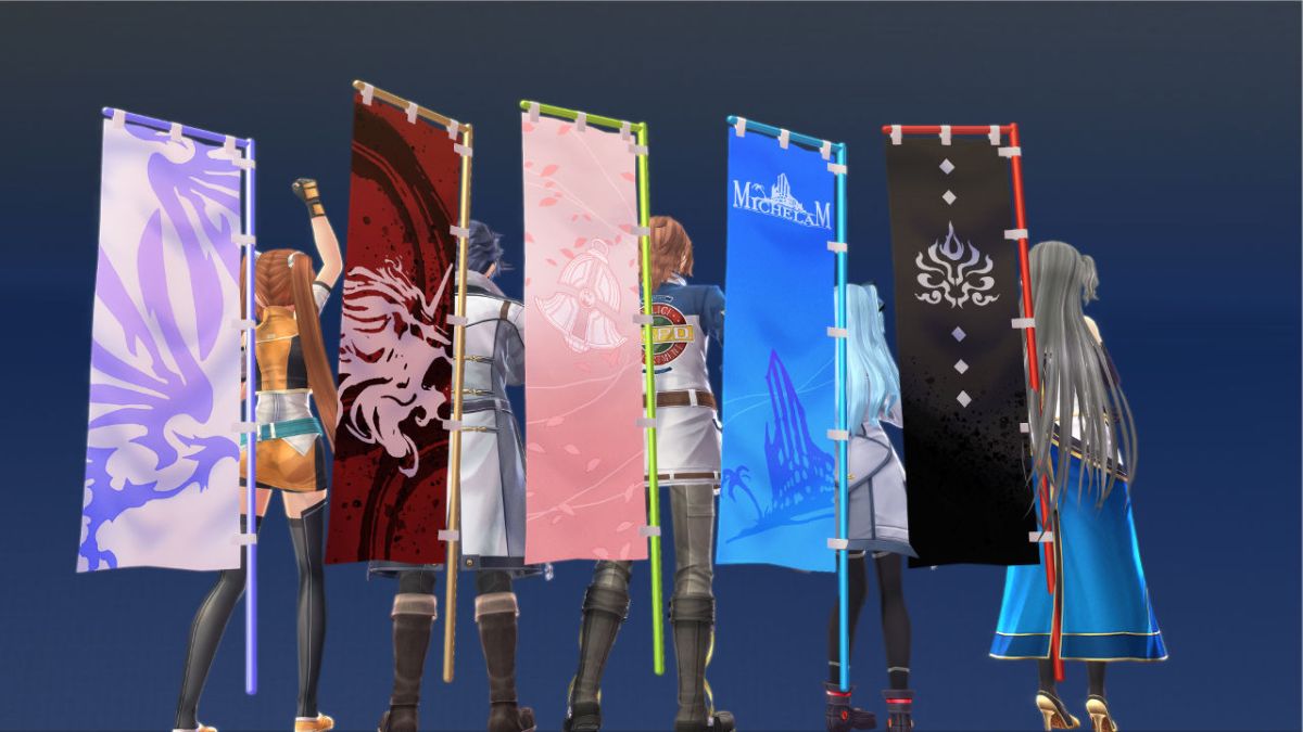 - Nobori Flag Set (165 yen): Allows characters to attach Nobori flags modeled after nations and organizations in Kiseki series on their backs (Liberl / Thors / Ouroboros / Crossbell / Michelam)