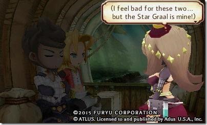 Well, I wasn’t disappointed when it came to the amusing part. Eloise’s story begins with her working in disguise at a bar on Avalon. She’s dressed up as an old, overweight woman and faking an accent, all in an attempt to learn more about the Star Graal before going after it for herself. Owen and Liber happen to be at the establishment, and Owen sees through her front. Deciding that the two are strong enough to act as her partners, she reveals her true self and the three form a party to explore the island in search of treasures.