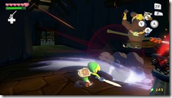 Of course, I didn’t need to use that with the Helmaroc King. The weapon you want to use is the hammer, which can shatter the Helmaroc King’s mask. The Wii U GamePad shows all of Link’s tools and bottles (I had two filled with life potions). At any time, you can drag different tools or items to different buttons on the GamePad to change Link’s equipment on the fly without pausing the game.