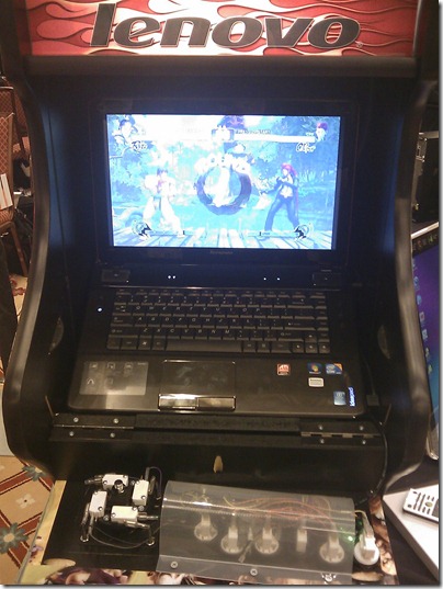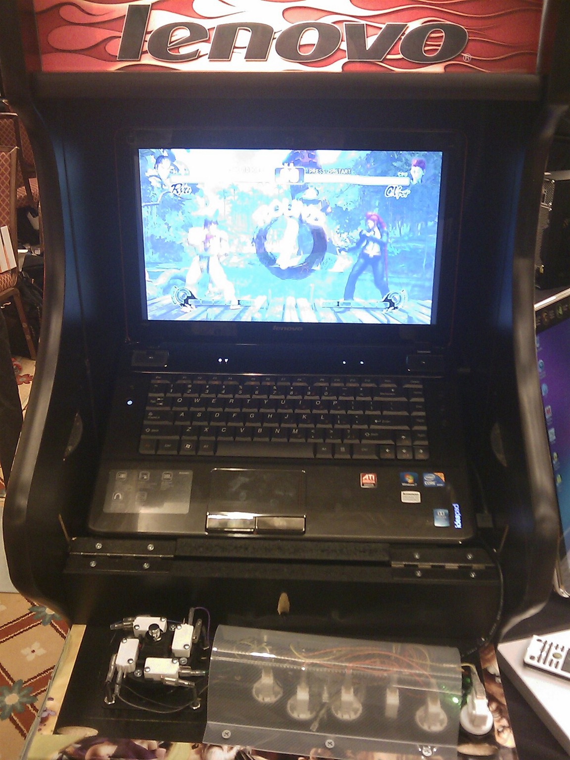 Ah, the miniature arcade machine is actually a laptop! When you unlock the stick and flip it down you can see the keyboard. Not shown in the photos is a slide out drawer with a USB keyboard.