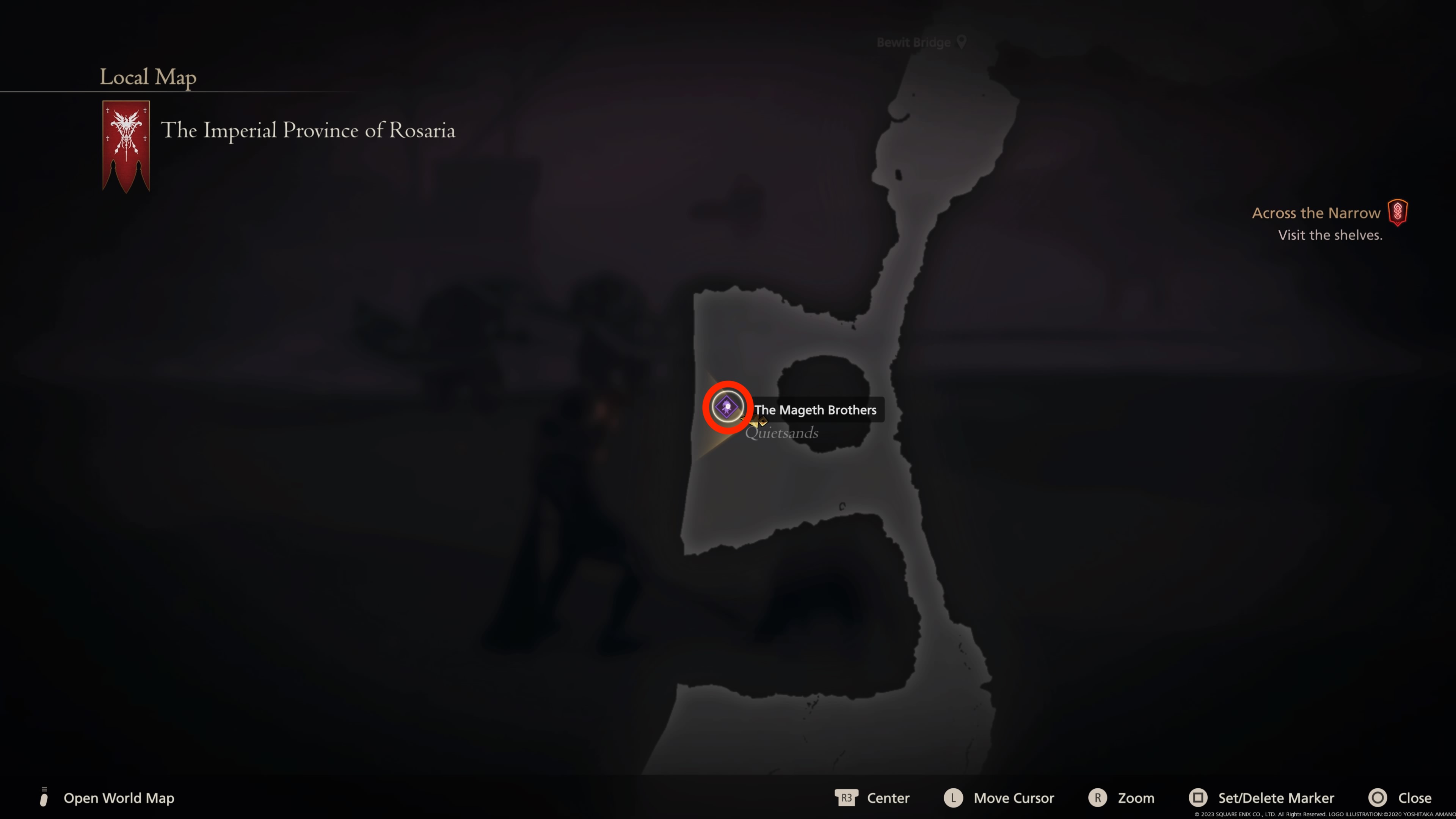 So once you get past the second timeskip, you’ll eventually see a marker come up for the Mageth Brothers in Final Fantasy XVI. I believe it was around for a bit for me before I finally decided to finish it before going into the “Across the Narrows” main quest. The Hunt Board notes it is in the Imperial Province of Rosaria map at Quietsands. This is a very small area that is essentially just a beach, so you can’t miss them. You’ll even see the trio standing on the shore if you go to where I highlighted in the screenshot below.