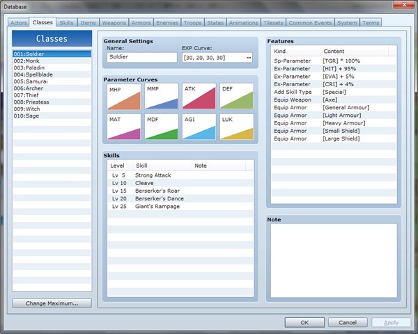 Classes: This tab is for creating the classes used by your playable characters. Classes determine a character’s stat growth as well as the skills they learn as they level up.