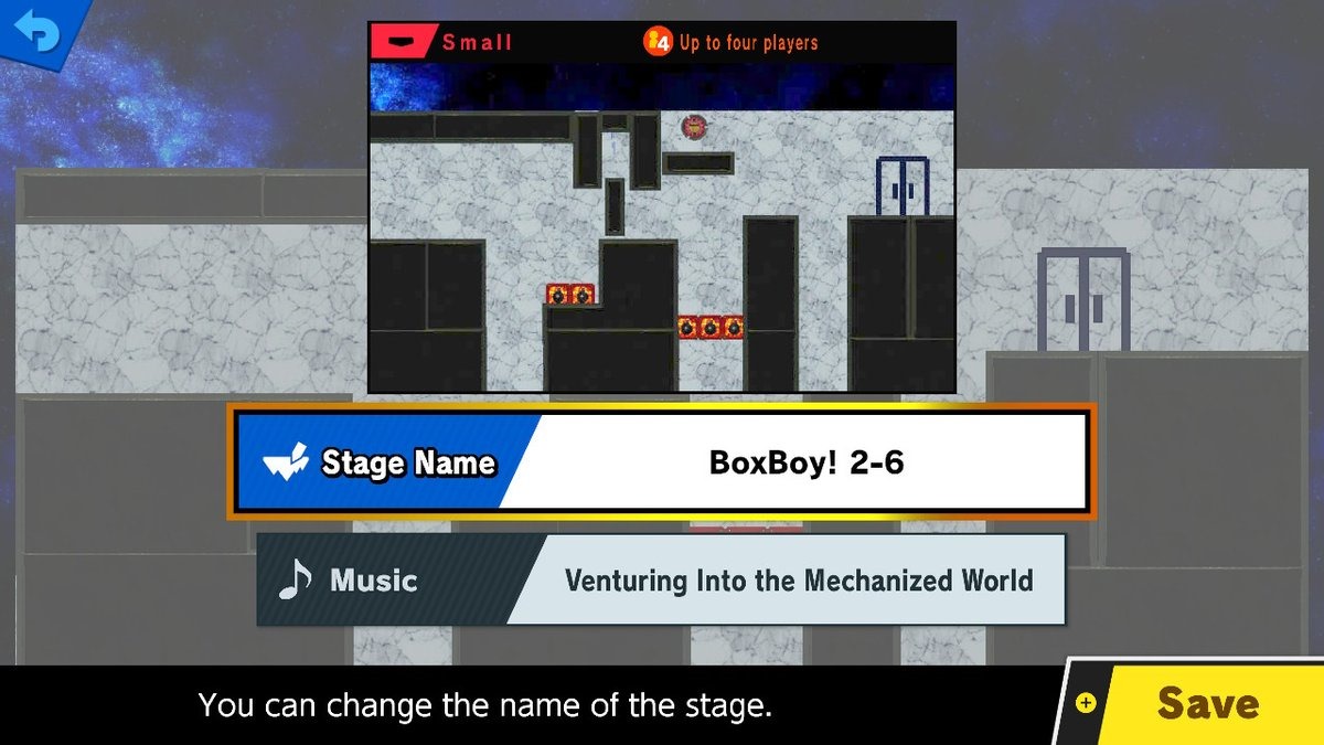 Thus, Very Bad Picross was born. (It is also known as, “Do you know how hard it is to draw the number 3 in Handheld Mode?”) The mind was willing, but the Stage Builder was weak. The level I made was functional. It is recognizable, in a Drawful sort of way. It even allows for platforms in different positions, to provide different areas for characters to fight on. It just looks incredibly sloppy. So, I went back to the drawing board. What other series that I love is celebrating a milestone soon? Oh, right. BoxBoy! + BoxGirl! is coming to the Nintendo Switch on April 25, 2019. (The same day as Picross S3!) The level design in the series is minimalistic, relying on various boxes and rectangles. As I established earlier, finding your footing and making something that looks good and works as a stage might take time in Super Smash Bros. Ultimate. Before someone starts experimenting with wild designs and elaborate settings, trying something a little simpler might be best.