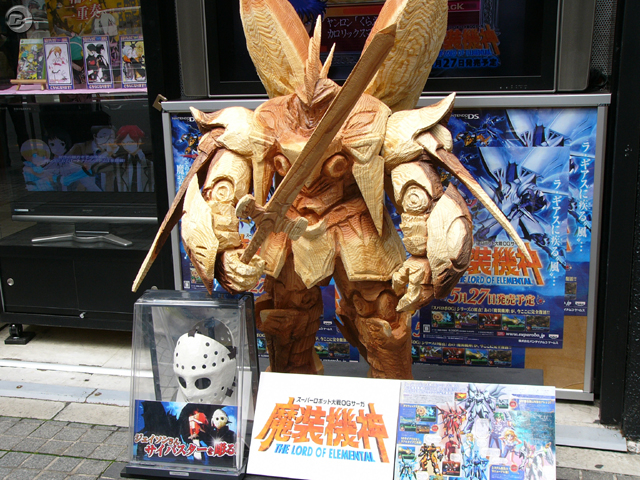 A wooden Cybuster statue seen outside of Messe Sanoh in Akihabara on Gpara. The display is a testament to Super Robot Taisen OG Saga: Masou Kishin The Lord of Elemental by “Jason-san”, an artist that carves wood sculptures with a chainsaw. The Friday the 13th hockey mask is like his calling card.