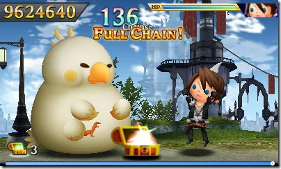 This is a rhythm-based role-playing game, featuring characters and settings from the Final Fantasy franchise, in which players must save the world by defeating various fantasy creatures. Players engage in rhythm-based battles (matching timed button presses with scrolling indicators) with dragons, goblins, demons, and half-human creatures. Players use pistols, swords, and arrows to attack enemies; battles are accompanied by impact sounds and light effects. Video clips from Final Fantasy games sometimes depict instances of violence: a figure impaled by a lance; characters shot with arrows and gun-like weapons; blood on the ground and/or characters’ faces and clothing. During the course of the game, some female characters wear outfits that reveal moderate amounts of cleavage. In-game passwords can include suggestive phrases (e.g., “Loves chasing tail,” “Panty shot,” and “Harem party”). The word “a*s” appears in the dialogue.
