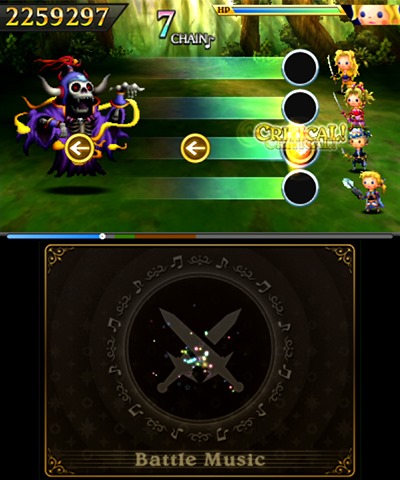 There sure are a lot of crossovers available to 3DS owners this holiday season. Persona Q, Professor Layton vs. Ace Attorney, Super Smash Brothers, Theatrhythm. All four of these games leverage the player’s affection for past titles and then mix and match characters. As a rule, I’ve never been much for this sort of fanservice. I would rather play something original or a sequel that substantively adds to an existing universe. Crossovers can feel like a victory lap for a successful brand—only the most popular brands get invited to crossovers and the content is often meaningless. On paper, Theatrhythm Final Fantasy Curtain Call seems like the sort of crossover I don’t like. The narrative is loosely defined nonsense that exists solely to justify bringing a lot of popular characters together. Neither the gameplay nor the art is reminiscent of the strengths of the original games. Turns out, though, that Theatrhythm is a blast to play.