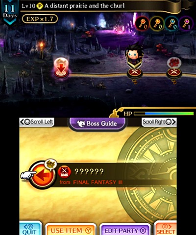 Theatrhythm is a rhythm game that allows the player to tap through three difficulties of note lines for over 200 songs drawn from all along the Final Fantasy family tree. The presentation of the note line changes depending on if the song is up tempo or more peaceful, but the rules of the game never change. Tap red dots, swipe in the direction of the arrow on yellow dots, hold down on green dots. The rules of the game don’t need to change, though. Every rhythm game is built on simple mechanics. What separates the good from the bad in this genre is the quality of the music and the incentives for the player to experience it. Theatrhythm nails both. The music part is easy; Final Fantasy has a musical pedigree unlike any in the video game medium. It would be hard to find 200 tracks not worthy of revisiting. Everyone will have his/her own favorites and of course not every favorite can be present, but the obvious bases have been covered and an awful lot of less obvious bases as well. As for the incentives, there are a lot. You are always unlocking things in this game. You’re unlocking characters, you’re finding items, you’re collecting character cards (like Smash Bros trophies but with the ugly Theatrhythm art), you’re unlocking randomized adventure mode maps, and through all of it you’re collecting experience to level up your party. Very rarely, you’ll even unlock a new song. At the end of any note line the player is almost sure to have gotten something of value, and the next goal will be only a song or two away.